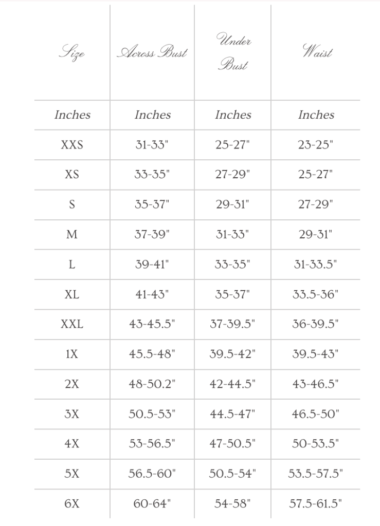 To the left, you’ll see the size chart as of Feb. 2023. As a 44DD bust, I wear a 2X comfortable in this newest size chart. One thing to note: If you are shopping secondhand, be sure to ask WHEN they bought the dress from Selkie. If it was before the Spring of 2022, it may be the older size chart and you’ll want to order a size up. (Ex: I wear a 3X in the old size chart).